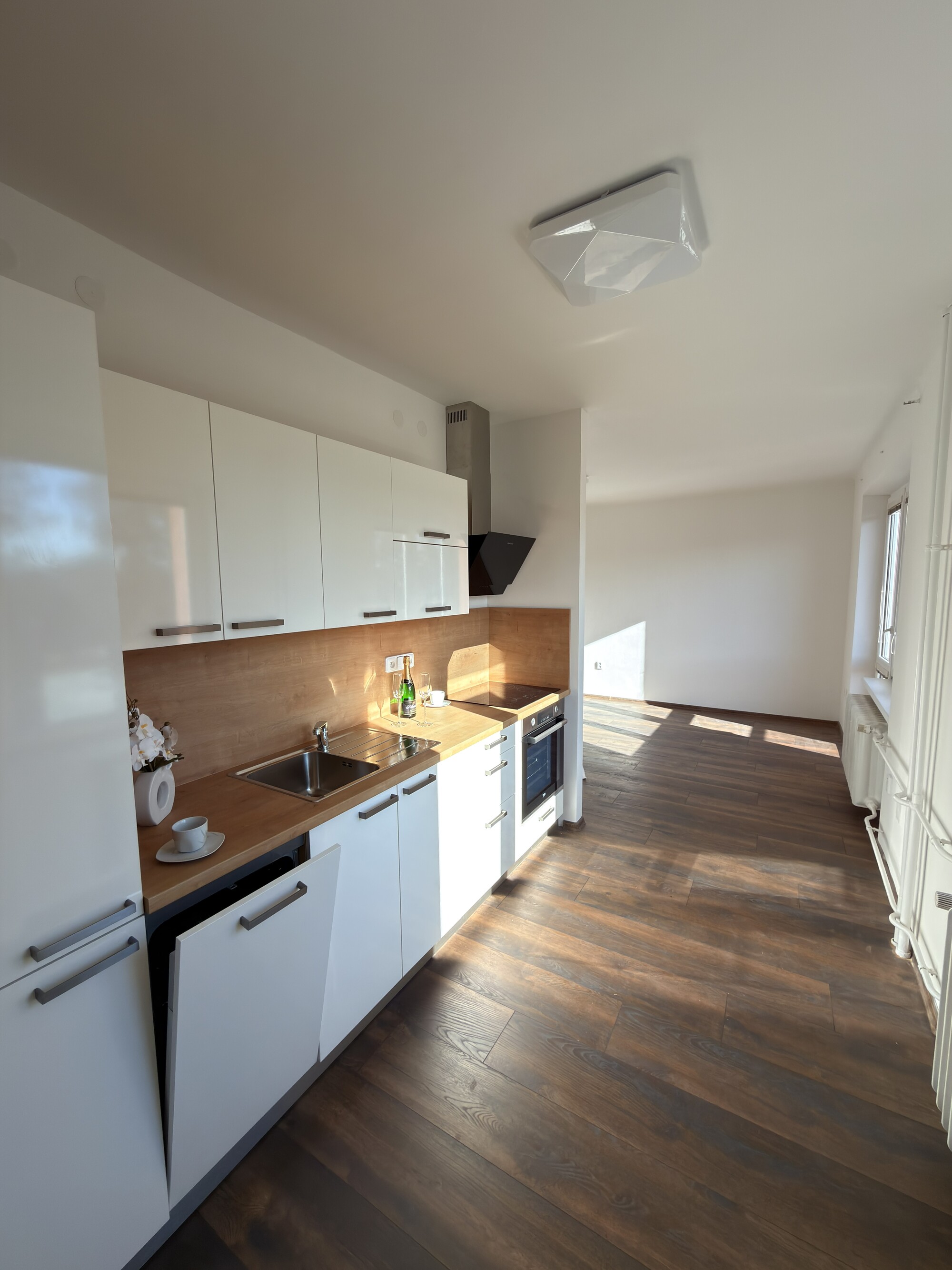 Kuchyň nabízí praktické a moderní zázemí – je zde potravinová skříň a vestavěné spotřebiče, konkrétně indukční varná deska, vestavěná elektrická trouba, digestoř a myčka, což výrazně zvyšuje komfort každodenního bydlení. Byt působí světlým a příjemným dojmem.